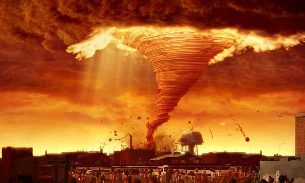 Флинту удается добиться того, что еда падает на жителей города буквально с небес. Теперь им доступны любые лакомства, о которых прежде нельзя было и мечтать. Но радость продлилась недолго: в сторону поселения устремляется ураган, сметающий все на своем пути. Сумеет ли Флинт исправить собственную оплошность?